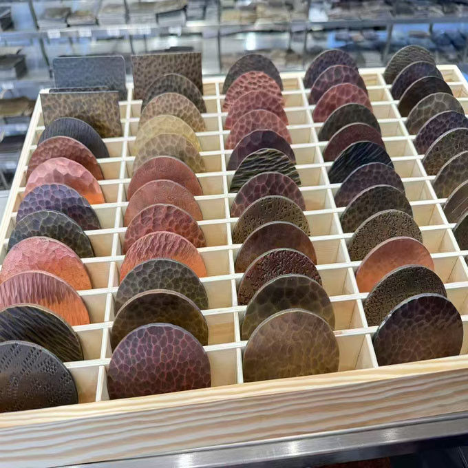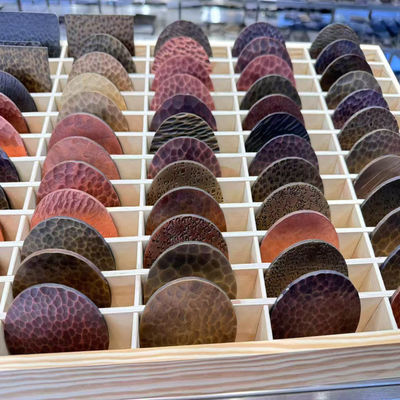 1.Martillado manual: Los artesanos utilizan martillos de trabajo con patrones para golpear manualmente la superficie de las placas de acero inoxidable, creando texturas desiguales.