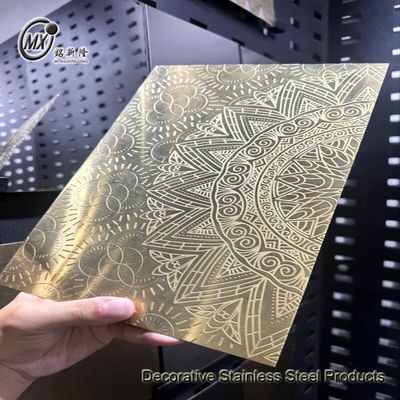 Los patrones grabados se crean aplicando selectivamente una película protectora resistente al ácido a áreas designadas y grabando con ácido las áreas no protegidas. El grabado elimina una fina capa de acero inoxidable, cambiando el color a un gris plateado opaco y rugosando la superficie, lo que se puede contrastar con el pulido, el súper espejo u otros acabados para crear miles de variaciones. El acabado grabado también se puede colorear antes o después del grabado. Se utiliza ampliamente para aplicaciones de decoración, como puertas de ascensores, paneles de pared, copetes y molduras.